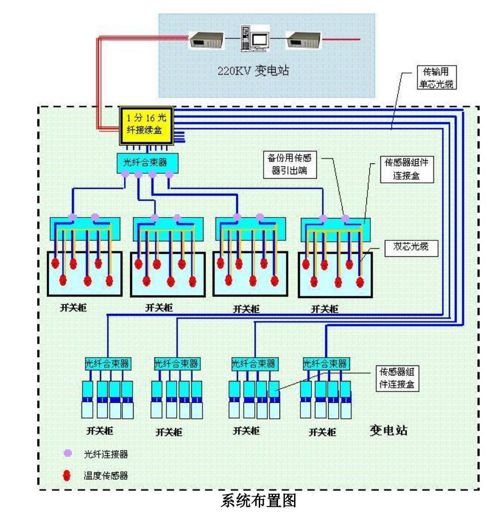 1.高压柜测温系统采用光纤光栅测温,数据使用原有通讯通道上传至总变已有的温度监控系统;